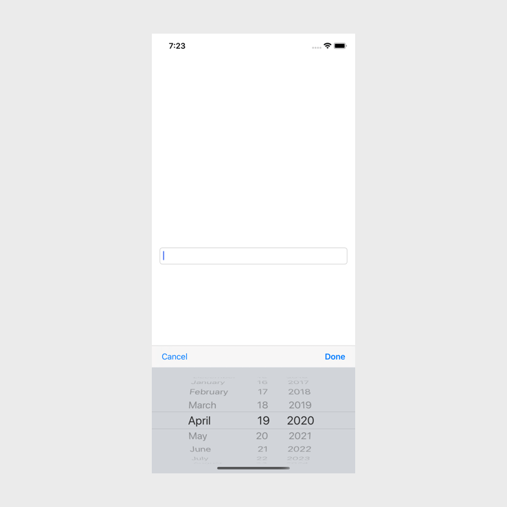 Lastly, we will resign first responder in the doneAction. If the user has clicked the done button it means that they have selected a date and therefore we do not need to have the date picker open anymore. If they want to edit the value, they can tap on the text field again.