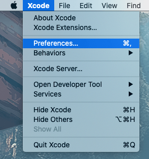 The first thing we need to do is to open preferences, there are two ways to do this. The first way is to click on Xcode in the top left of the menu bar and then to click on Preferences: