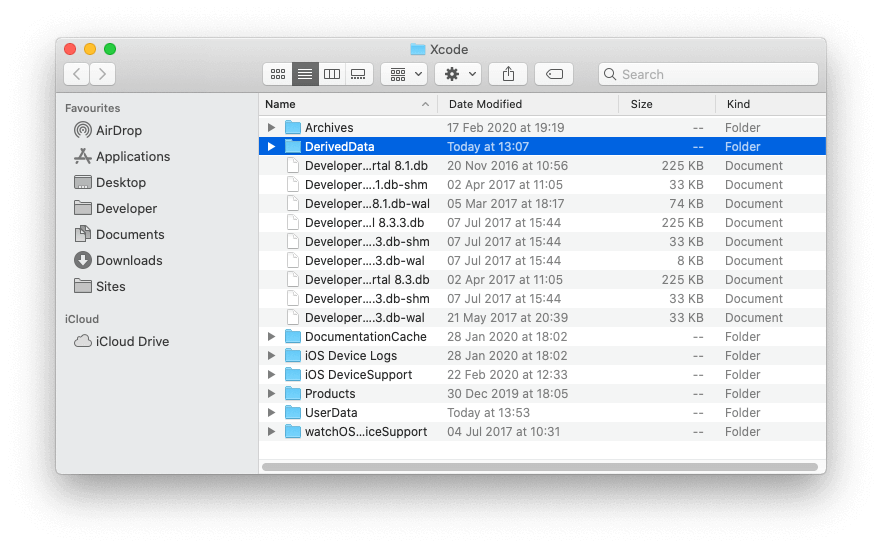 Now that Xcode is closed and our DerivedData folder is location is open in finder, we can delete the whole DerivedData folder.