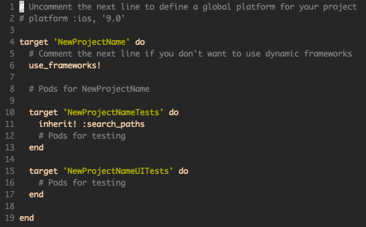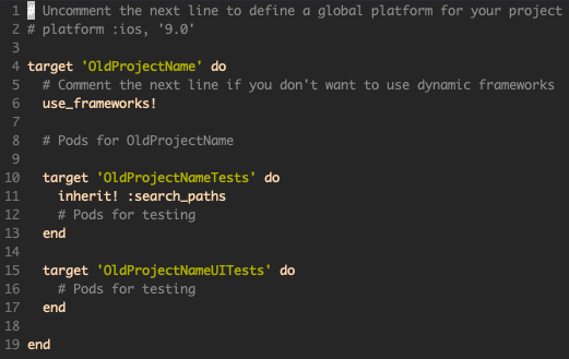 After we have run pod deintegrate we need to update our Podfile by changing the old project name to the new one, my old Podfile looked like this:
