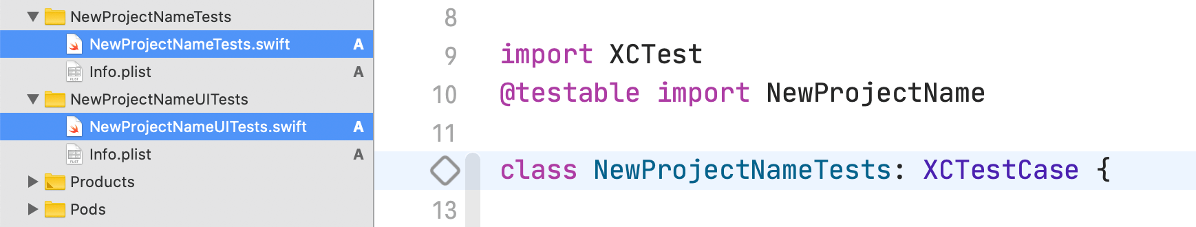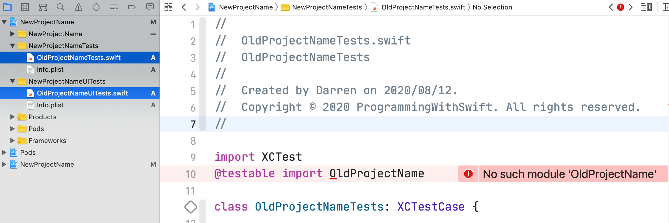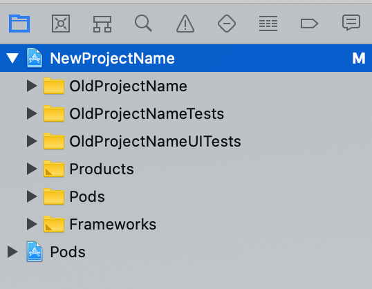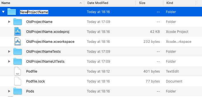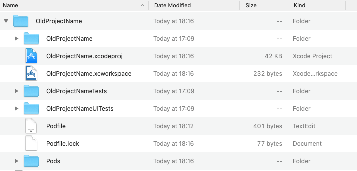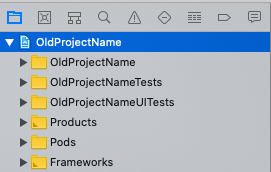 As you can see, I have Tests, UITests and a Podfile. This way we can see how to rename a project that has most of what a regular project might have.