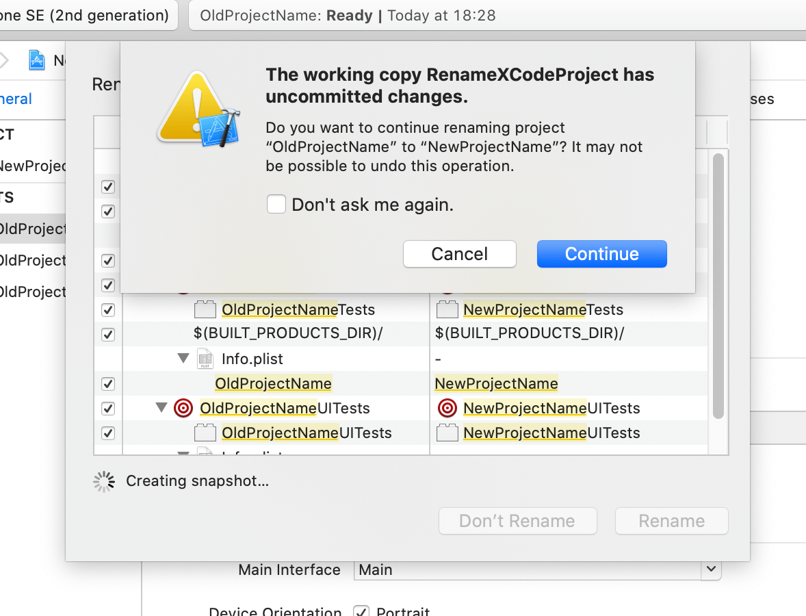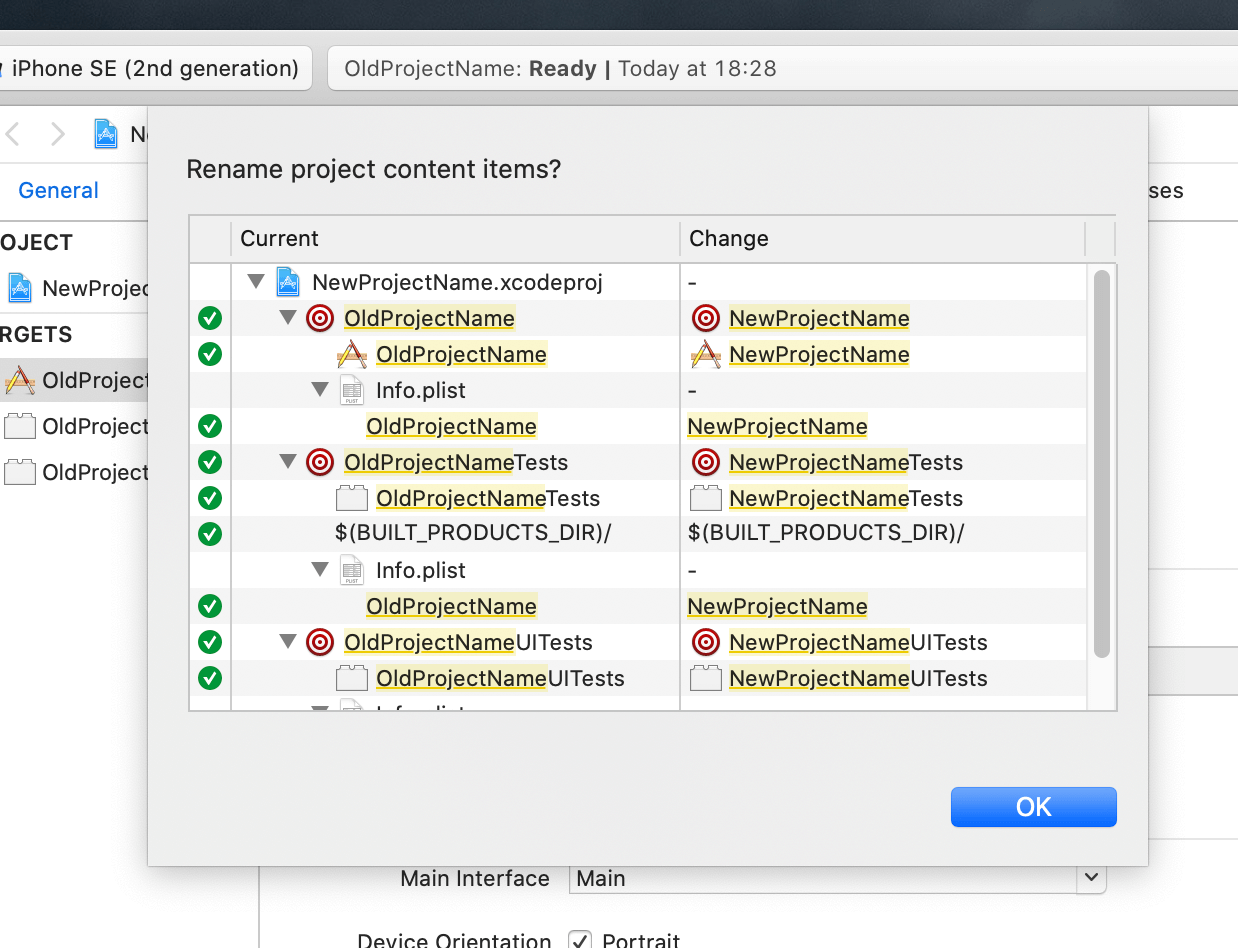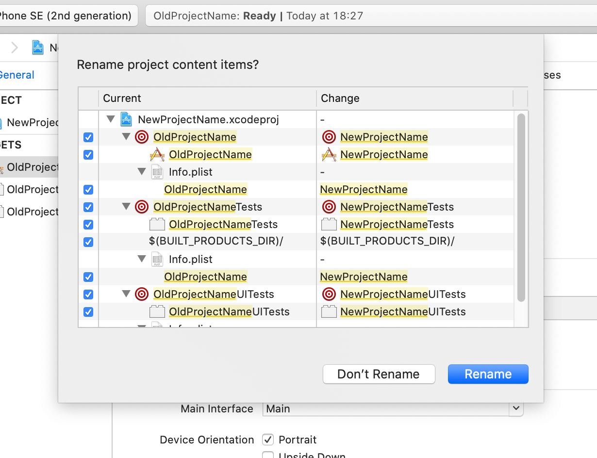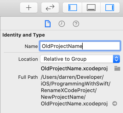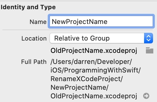 Renaming a project can be a common task. You could start with a name for your project and then during the development process you decide that you want to rename the project. Unfortunately Xcode does not come with built in functionality to do this, so we need to do it manually.