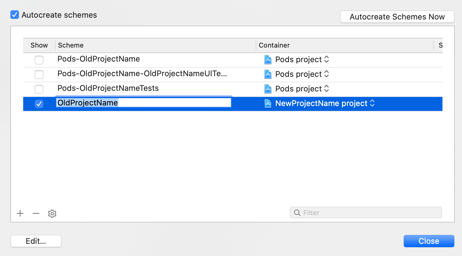 Double click/Press enter on the old scheme to make the field editable, change the name to your new project name and click close.
