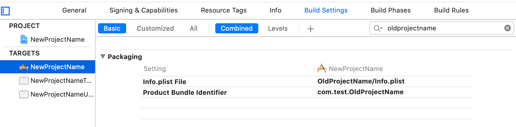 As you can see in the above image, I have clicked on my projects target and then I clicked on the build settings tab at the top. Once you have done that, type your old project name into the search bar. For me, this shows that there are two places that I need to update the old name to the new name.
