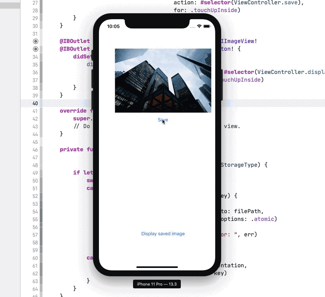 }If you add this code you will not be able to build your project. So to fix that problem we need to implement those two functions, save and display. The save function will call the store function that we created earlier and the display function will call the retrieveImage function and then display the image that was returned, either from the fileSystem or from UserDefaults. These two functions look like this: