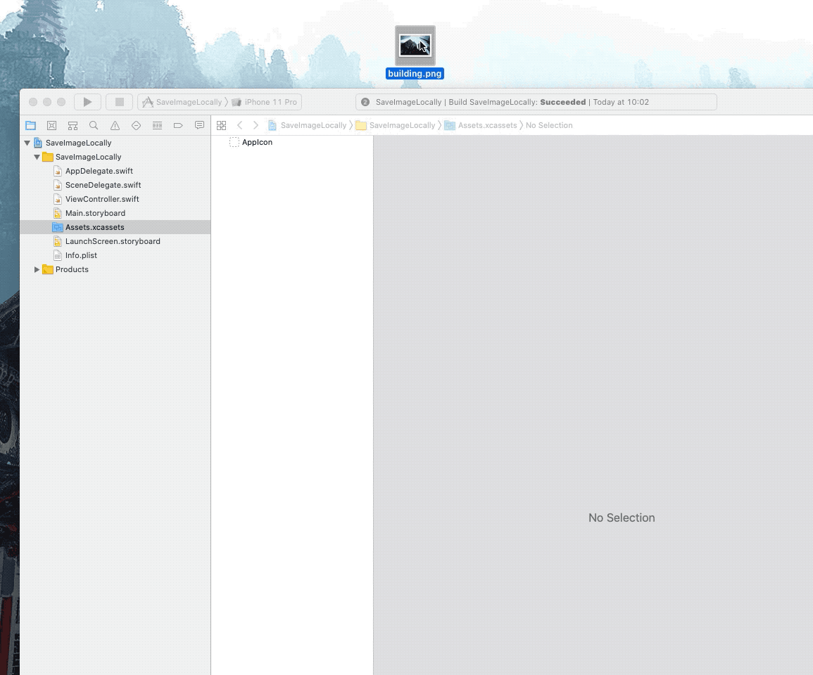 The last thing that we need to do is to add the building image to our project. To do that you need to download the image from here, and then open Assets.xcassets in Xcode and drag the building image into Xcode, like this: