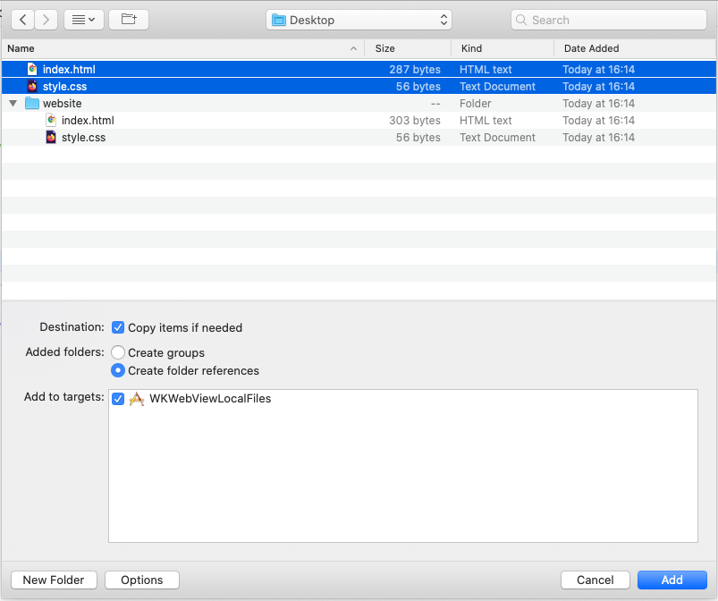 Once you have clicked "Add Files to", you will be prompted to select the files/folders that you want to add to your project. When you see the below dialog, make sure that you have selected the correct targets as well as "Copy items if needed" and "Create folder references" as you can see in the below image.
