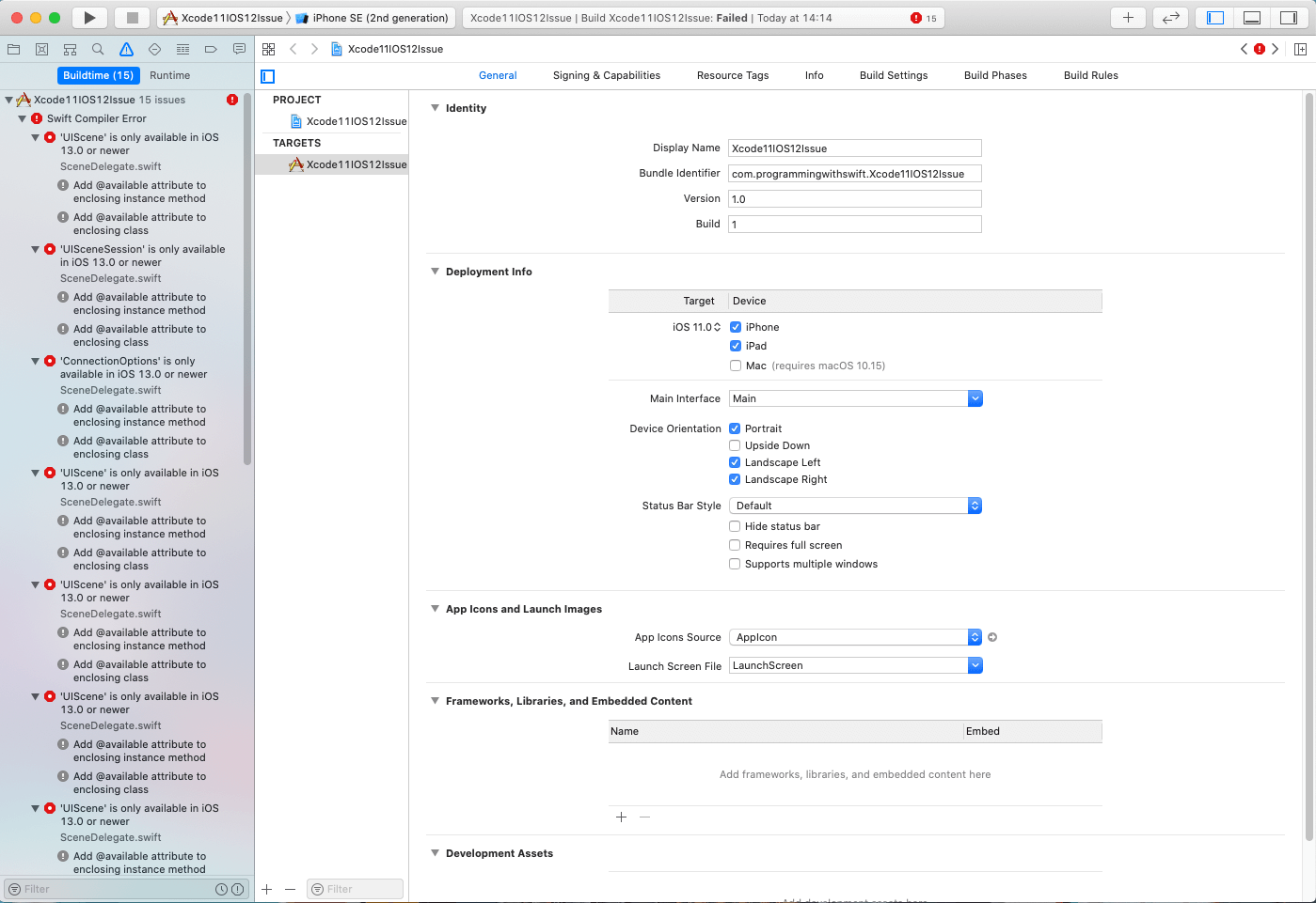 Recently I created an empty project that I wanted to get it running on iOS 11, but, because the app was created with Xcode 11, I had to go into the General settings and change my deployment target from iOS 13 down to iOS 11.